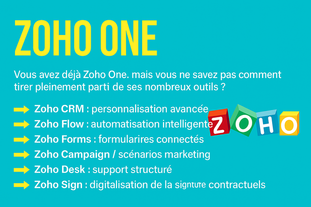 Que vous soyez en phase de lancement ou déjà utilisateur avancé, je vous aide à tirer le meilleur parti de Zoho One.