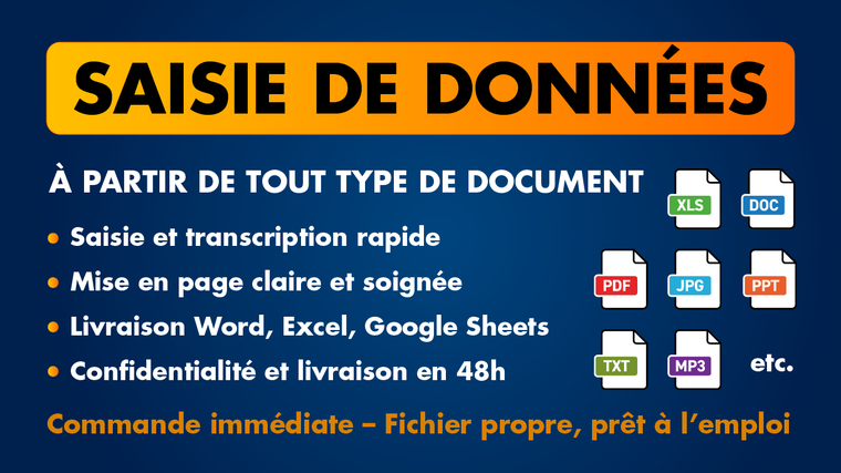 Je vous propose un service fiable, rapide et rigoureux de saisie de données sur mesure, à partir de vos documents papier, PDF, images ou fichiers numériques.
