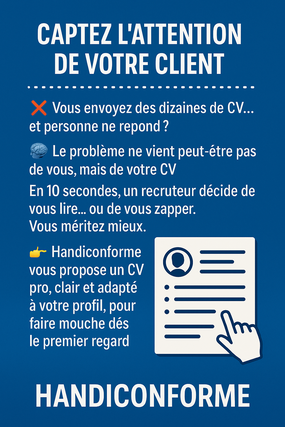 Handiconforme vous propose un CV pro, clair et adapté à votre profil, pour faire mouche dès le premier regard