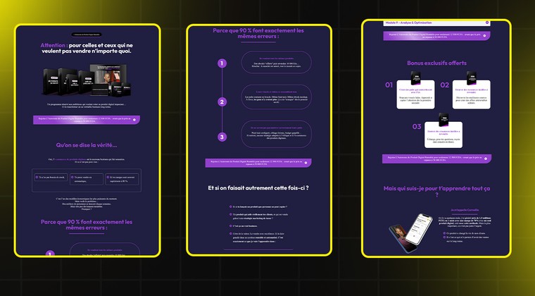 Tunnel de vente complet (4 pages) : une page de capture optimisée, une page de vente longue et détaillée, une page de paiement fluide et une page de remerciement stratégique + Suivi de 14 jours livraison en 7 jours.