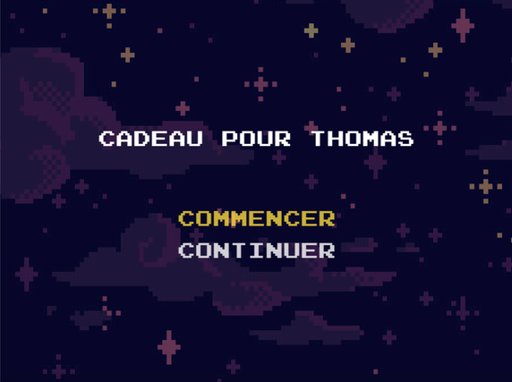 Faîtes jouer la personne à qui vous voulez faire une surprise à ce jeu d'aventures 2D rétro. Le héros personnalisé doit venir vous sauver ! Il aura pour mission d'aller au bout des 15 salles du jeu, vaincre 3 types d'ennemis différents (épis de maïs, démons rouges et papiers administratifs !) et 3 types de boss différents. Ces derniers peuvent être personnalisés par des photos de ses proches ! Une fois le jeu terminé, le joueur aura l'occasion de voir votre message personnalisé ainsi qu'une photo que vous aurez choisie.