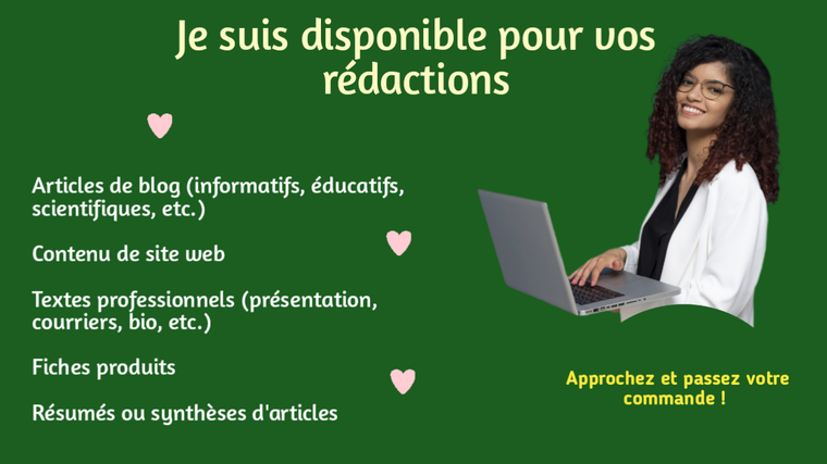 Je suis Doriane, diplômée en physique-chimie et étudiante en sciences politiques. Passionnée par la rédaction, je vous propose mes services pour rédiger vos contenus en français de manière claire, fluide et professionnelle.