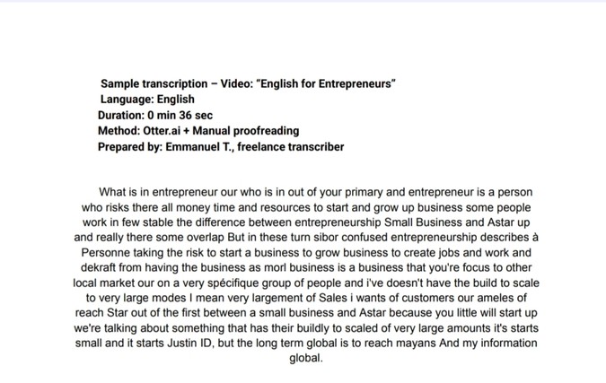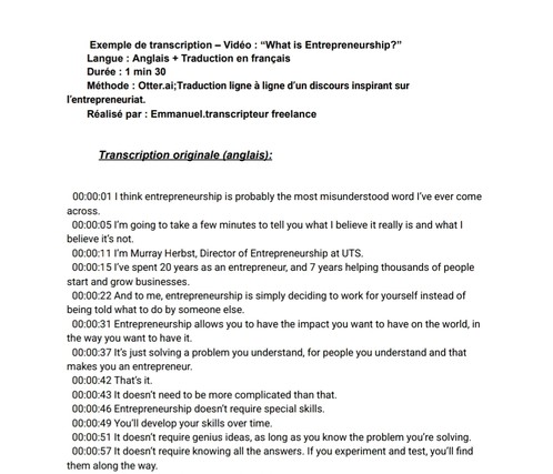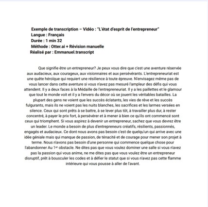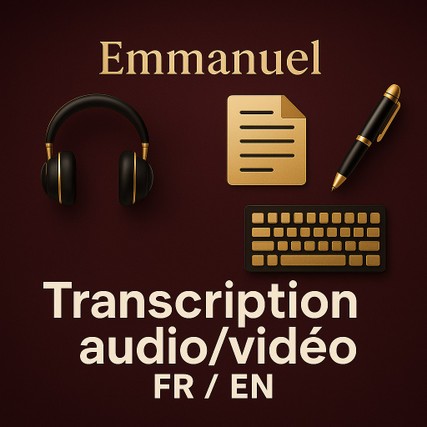 “Je suis Emmanuel, transcripteur freelance bilingue français / anglais. Je transforme vos fichiers audio ou vidéo en textes clairs, fidèles et professionnels. Je travaille manuellement, avec relecture, mise en page soignée et confidentialité garantie. Podcasts, interviews, conférences, vidéos YouTube… je m’adapte à vos besoins. 🎁 Test gratuit sur 1 minute d’audio pour découvrir mon style. Disponible à distance, réactif, et toujours à l’écoute.”