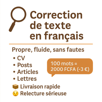 Bonjour et bienvenue sur mon profil. Je corrige vos textes en français : orthographe, grammaire, style et clarté. Que ce soit un CV, un post réseau, un article ou une lettre, je vous livre un texte fluide, sans fautes, et fidèle à votre ton. 💬 100 mots = 2000 FCFA (~3 €) 📦 Livraison rapide, relecture sérieuse ➡️ Qualité pro, résultat propre, sans chichi. I proofread your French texts: grammar, clarity, style. CVs, posts, blogs, letters… I deliver clean, fluent, professional content. 💬 100 words = ~3 € 📦 Fast delivery, careful review