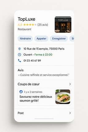 Je vous aide à créer et optimiser votre fiche Google My Business de A à Z, afin de vous rendre visible localement, apparaître dans les résultats de recherche et attirer plus de clients qualifiés.