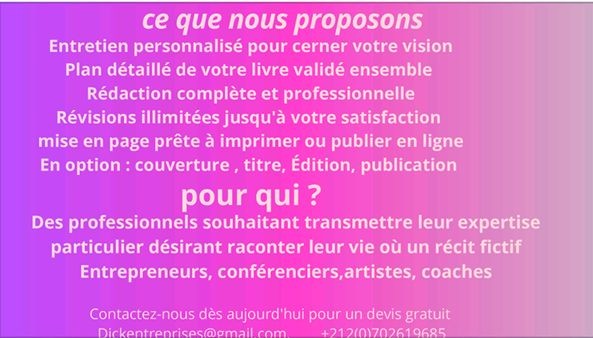 Que vous souhaitiez partager une histoire personnelle, un roman captivant, un essai inspirant, ou encore un livre pratique, je mets ma plume à votre service pour donner vie à vos idées avec structure, style et authenticité.