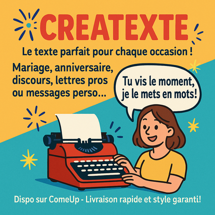 🎶 Je crée ta musique personnalisée sur-mesure (tous thèmes) Tu veux une chanson unique, créée juste pour toi ou pour offrir ? Je compose ta musique personnalisée, à partir de ton histoire, ton message ou ton idée, quel que soit le thème (amour, humour, anniversaire, hommage, motivation, projet pro…). 🔧 Ce que tu obtiens : • 🎤 Texte sur-mesure (avec les infos que tu me donnes) • 🎼 Composition musicale originale (style au choix : rap, pop, acoustique, etc.) • 🔊 Fichier audio final livré en MP3 (ou WAV si besoin) 💡 Idéal pour : • 🎁 Un cadeau vraiment original • 📹 Une vidéo perso ou pro • 💌 Une déclaration surprise • 🧑💻 Une intro/outro de contenu (YouTube, podcast…) ⸻ 🎯 Comment ça marche ? 1. Tu choisis ton thème 2. Tu m’envoies quelques infos clés 3. Je crée ta chanson en quelques jours, avec soin et créativité 🎧 Musique faite à la main, avec passion – pas d’IA, pas de copier-coller ! 📩 Prêt à transformer ton message en musique ? Clique sur “Commander” et on démarre ! 🎵 ** Createxte ! ** 🎤 Besoin du bon mot pour le bon moment ? Mariage, anniversaire, discours d’entreprise, remerciements ou simple toast entre amis — chaque événement mérite un texte à sa hauteur. ✍️✨ Je crée pour vous des mots sur mesure, taillés dans l’émotion, l’humour, l’élégance ou l’authenticité, selon vos envies. Parce que derrière chaque moment marquant, il y a une phrase qui reste. 💬💫 📅 Un événement à venir ? Laissez-moi vous aider à trouver les mots justes, pour ne jamais passer inaperçu. 📩 Texte unique, livraison rapide, émotion garantie. ** Crea-itineraire ! ** 🌍✈️ Un voyage, ce n’est pas juste une destination… c’est une expérience à vivre pleinement. Vous rêvez d’un itinéraire pensé juste pour vous ? Fini les plans touristiques copiés-collés ! 🎯 Je crée votre voyage sur mesure, selon vos envies, votre rythme, votre budget. Que vous soyez aventurier, romantique, explorateur urbain ou amateur de détente, chaque étape sera choisie avec soin pour vous faire vivre l’inattendu… en toute sérénité. 🧭 Road trip, escapade culturelle, retraite nature ou city break : dites-moi où vous voulez aller… je vous montre comment y rêver. 📩 Itinéraire personnalisé, astuces locales, conseils exclusifs — votre prochain voyage commence ici.