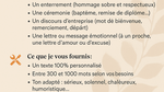 • Ton adapté : sérieux, solennel, chaleureux, humoristique…
