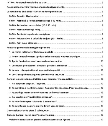 C’est un ebook 100 % personnalisé, basé sur tes objectifs, ton niveau, ton vécu pour t’aider à rester focus, motivé et discipliné jour après jour.