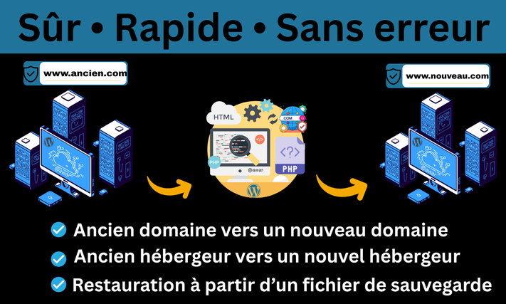 Je vous propose la migration complète et sécurisée de votre site WordPress, jusqu’à 100 Go, vers un nouveau domaine ou hébergement.