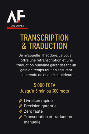 Transcription + Traduction (jusqu’à 5 minutes ou 300 mots) : 8 000 FCFA au lieu de 10 000 FCFA