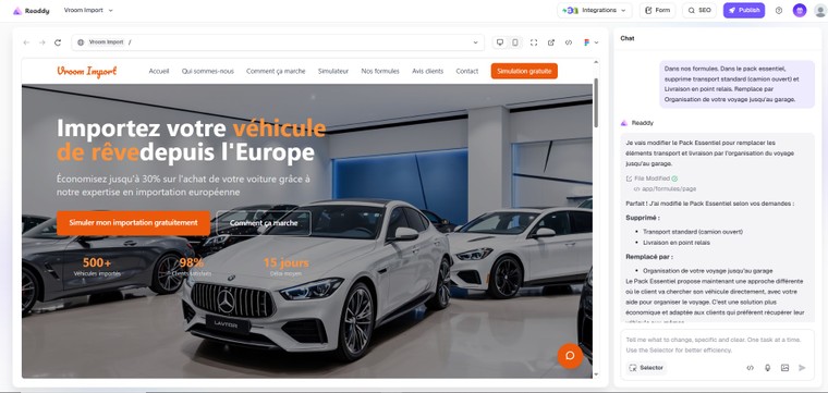 ~Ajout de fonctionnalités spécifiques selon la version choisie (chatbot, simulateur, timeline, carrousel, formulaire de devis, packs, etc.)