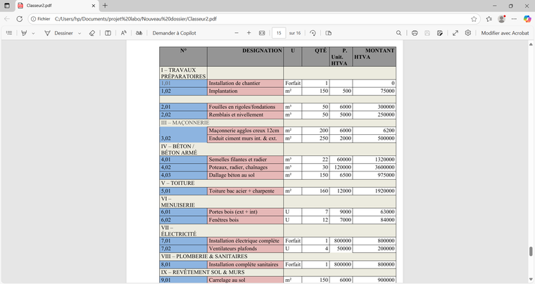 • Désignation des travaux : chaque poste est détaillé (ex. fondations, maçonnerie, toiture, plomberie…).
