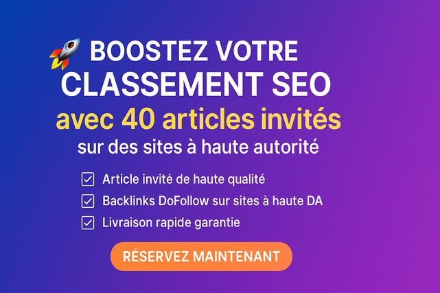 Propulsez vous en tête des résultats de recherche avec 40 articles invités sur des sites à forte autorité, dotés de backlinks DoFollow puissants. Boostez dès maintenant votre classement SEO et votre crédibilité en ligne grâce à notre service exclusif.