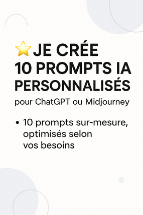 Je vous crée 10 prompts ultra-optimisés et personnalisés pour que ChatGPT ou Midjourney vous délivre exactement le contenu ou les visuels que vous imaginez… sans tâtonner.