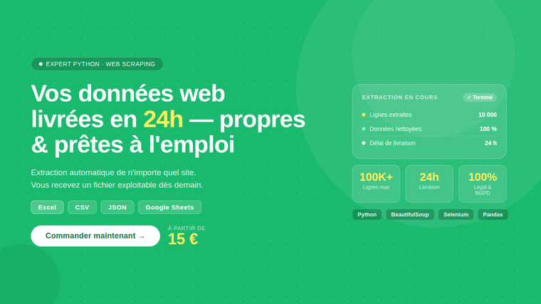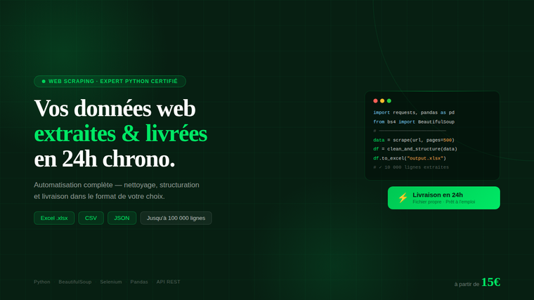 Extraction ultra-précise — Python, BeautifulSoup, Selenium, Pandas et API REST. Même les sites dynamiques ne me résistent pas.