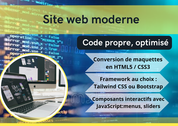 Je suis développeur front-end spécialisé en HTML, CSS, JavaScript, et j’utilise Tailwind CSS ou Bootstrap pour créer des sites web propres et esthétiques.