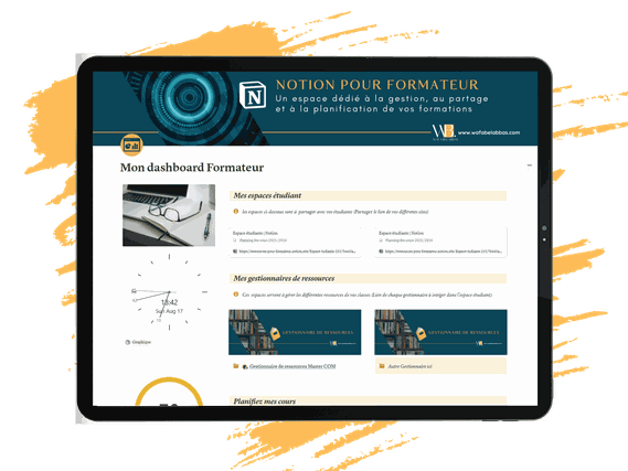 Vous y retrouverez également : plusieurs pages organisées, des bases de données, des calendriers interactifs, des to-do lists, ainsi qu’une horloge, un calendrier et la météo en temps réel.