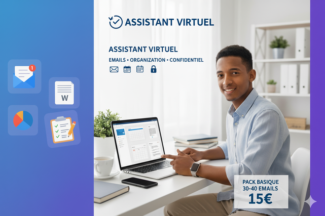 Passionné par l’organisation et la bureautique, je propose un service d’assistant virtuel sérieux, efficace et confidentiel. Mon objectif est de vous offrir un travail soigné, rapide et parfaitement adapté à vos besoins.