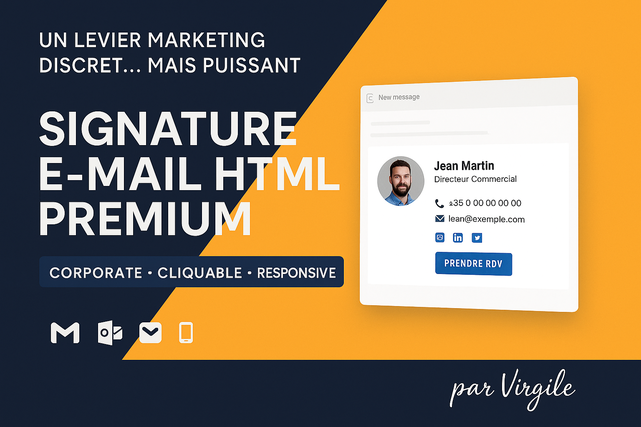Je suis Virgile, créateur digital spécialisé dans le design et l’intégration HTML. J’ai aidé de nombreux professionnels à renforcer leur image de marque grâce à des signatures e-mail HTML modernes, corporate et 100 % cliquables.