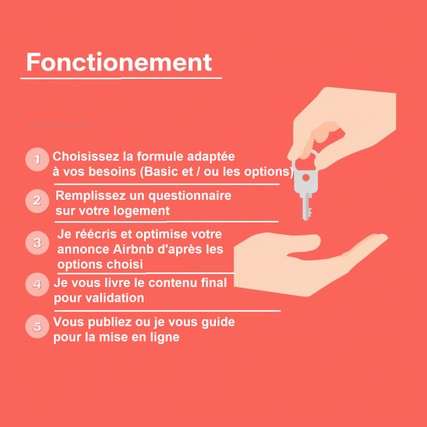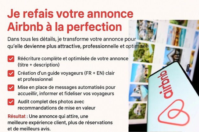 Je vous aide à transformer votre annonce en un véritable atout : séduisante pour les voyageurs, performante pour vous. Grâce à une rédaction persuasive et une présentation soignée, vous attirez plus de clics, plus de réservations, et de meilleurs avis.