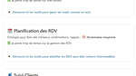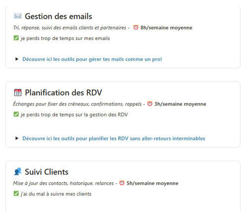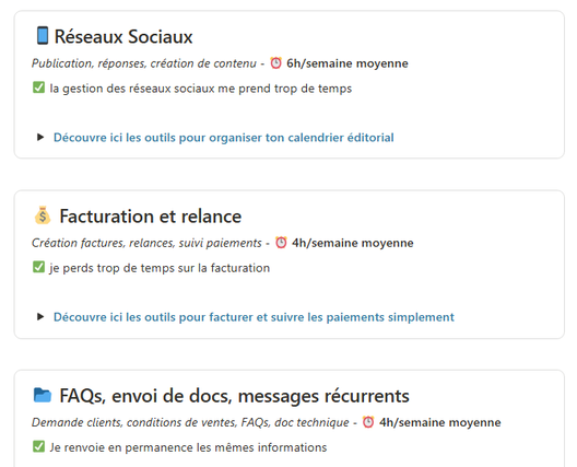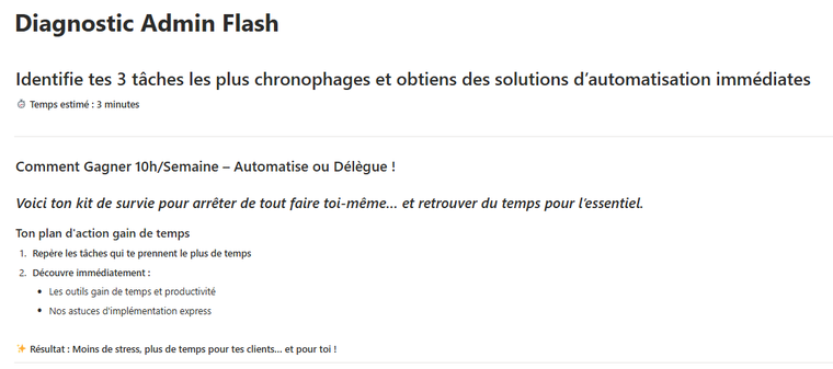 - Un Diagnostic Flash – une page interactive qui t’aide à repérer immédiatement les points faibles de ton organisation. En quelques minutes, tu comprends où tu perds ton temps et ton énergie, grâce à 6 tâches chronophages récurrentes (gestion des mails, facturation, suivi client, planification de RDV, FAQ (messages récurrents) et réseaux sociaux.