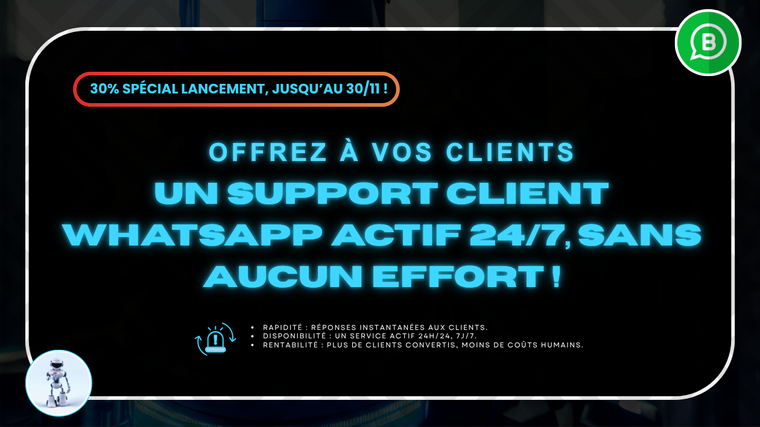 * Ne laissez plus vos clients attendre. Profitez de **-30% jusqu’au 30 novembre 2025** et transformez WhatsApp en un véritable **service client humain et automatisé, disponible 24/7.***
