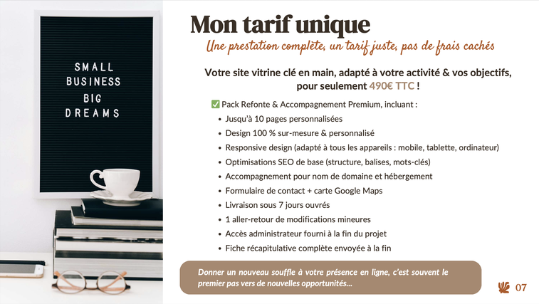 Je propose la refonte complète de votre site vitrine existant afin qu’il corresponde enfin à l’image professionnelle que vous souhaitez transmettre à vos clients. Avec cette refonte, vous repartez sur des bases solides : un site moderne, clair et efficace qui donne envie de vous contacter. Le tout à un tarif unique de 575,30 $US TTC, sans mauvaise surprise et avec un accompagnement premium de A à Z.