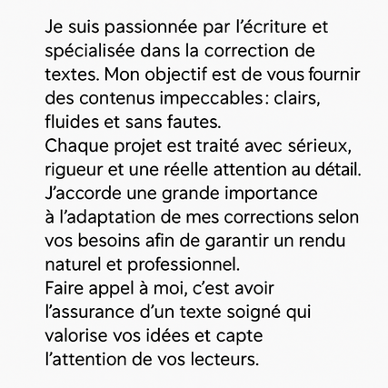 FR : Étudiant en licence 3 de sciences juridiques, je mets mes compétences en rédaction au service de vos projets. Sérieux, rigoureux et à l’écoute, je suis également formé en développement personnel et leadership, ce qui me permet de travailler avec méthode, autonomie et professionnalisme. Que ce soit pour corriger, reformuler ou rédiger un texte, je veille à livrer un contenu clair, sans fautes et adapté à vos besoins. EN : I'm a third-year law student offering my writing skills to support your projects. Serious, detail-oriented, and a good listener, I also have training in personal development and leadership, which allows me to work with discipline, autonomy, and professionalism. Whether you need proofreading, rewriting, or original content, I deliver clear, error-free, and tailored texts to meet your needs.