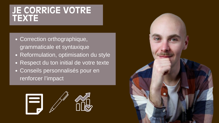 Bonjour ! 🎓 Je suis auteur et ancien professeur de langues, spécialisé en français et en espagnol. Je mets aujourd’hui mon expérience au service de vos textes, qu’il s’agisse de manuscrits, de mails professionnels ou de documents académiques. Je possède un Master en langue hispanique. J'ai écrit plusieurs romans, des poèmes et thrillers, et j'ai décidé d'utiliser mon expertise pour vous accompagner. 🖋️ Ce que je vous propose : Correction et optimisation de vos écrits, CV, lettres de motivation : orthographe, grammaire, syntaxe, style fluide, adapté au ton que vous souhaitez transmettre. Bêta-lecture de vos manuscrits : cohérence de l’intrigue, rythme, personnages, suggestions constructives avec synthèse. Rédaction de textes professionnels : mails, CV, articles. ✅ Pourquoi me choisir ? J'aurai un œil humain sur votre écrit, et j'accorderai une importance toute particulière au style et à l’intention de l’auteur. Je partirai de vos consignes pour conserver l'essence même de votre écrit. Je m'engage à conserver la confidentialité de votre écrit. Je fais preuve de réactivité et d'écoute, je fais des retours constructifs et détaillés avec des synthèses expliquant mes corrections. → Qu'est-ce qui m'a amené à proposer mes services ? Mon expérience d'auteur de thrillers, de poèmes et d’un témoignage publié. J'aime profondément la langue française, et manier les mots pour sublimer des textes. Mon expérience de professeur m'a fait comprendre à quel point j'aime enseigner, accompagner avec pédagogie, clarté et bienveillance. Mon expérience en relationnel avec la clientèle m'a montré que je souhaite me sentir utile en vous aidant à réaliser vos projets. Parce qu'un retour client positif n'a pas de prix. J'ai déjà accompagné des auteurs via la bêta-lecture et la correction. Leur satisfaction m'a donné encore plus envie d'accompagner d'autres clients. Mon objectif est simple : vous offrir des textes clairs, fluides et sans faute, tout en respectant votre style unique. Tout ceci, pour vous aider à atteindre la meilleure version de votre texte. Contactez-moi pour un service personnalisé et un retour humain et détaillé sur vos écrits, ou simplement si vous avez des questions. Voici mon mail : [email protected]