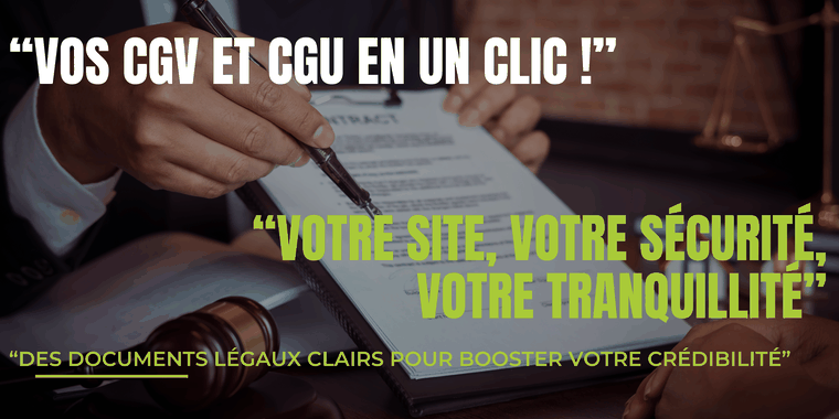 Protégez votre activité en ligne et inspirez confiance à vos clients grâce à des documents légaux clairs, professionnels et 100 % conformes à la législation française (loi Hamon, RGPD, etc.).