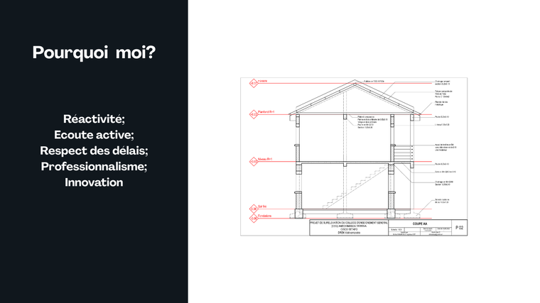 Professionnalisme : Je suis diplômé en Bâtiment et Travaux Publics et dispose de connaissances du secteur. Je vous livrerai des plans 2D/3D de qualité et respectant les normes architecturales et techniques. Ainsi, vous pouvez utiliser mes livrables pour votre demande de permis de construire ou pour réaliser le projet ;