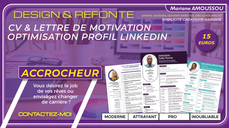 • Bonus : ajout de votre photo + ajout QR code vers LinkedIn ou portfolio + conseils personnalisés CV (photo, titre, expériences, formations) + design lettre de motivation (recto/verso) + 2 mockups du rendu + refonte complète profil LinkedIn