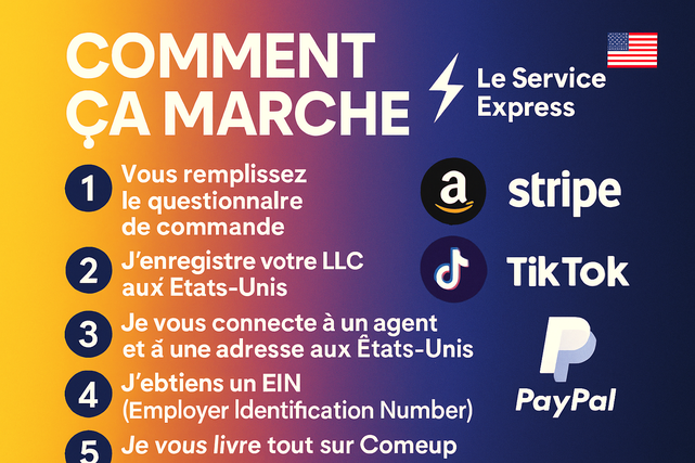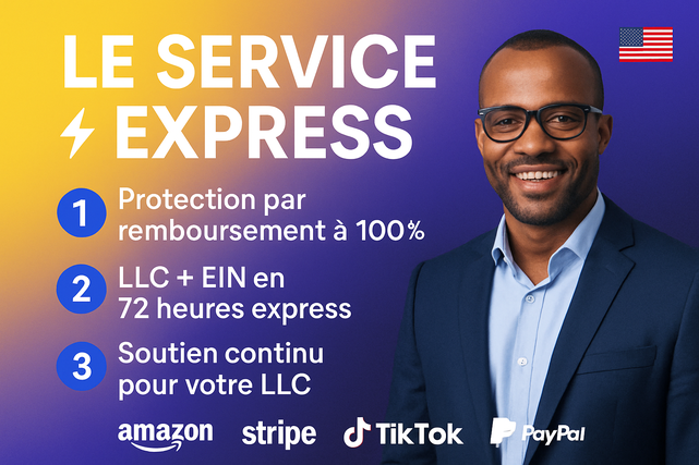 je vous propose un service complet et professionnel de création d’entreprise llc aux usa pour non résidents américains le prix standard est de 816,58 $US avec une option express à 934,07 $US pour une création en seulement 3 jours vous recevrez tous les documents officiels nécessaires y compris votre numéro ein et l’assistance pour l’ouverture de votre compte bancaire N’attendez plus pour concrétiser votre projet aux usa commandez dès maintenant et bénéficiez d’un accompagnement personnalisé et rapide garantissant la conformité légale et la réussite de votre entreprise