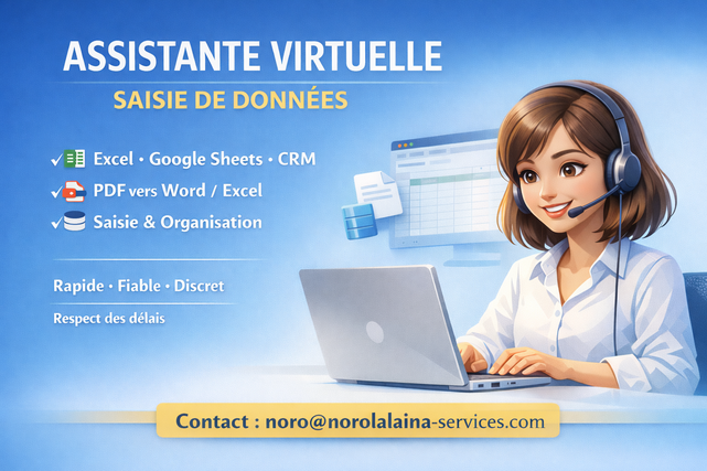 👩💻 Je suis Ony, spécialisée en support administratif et assistance virtuelle. Mon objectif : vous aider à organiser et optimiser vos tâches quotidiennes pour vous faire gagner du temps et améliorer l’efficacité de votre activité. 📧 Gestion des emails : Organisation, tri et réponse aux emails pour un suivi efficace et structuré. Gestion professionnelle des communications pour que rien ne vous échappe ⚡. 🧾 Saisie de données : Saisie précise et rigoureuse de fichiers Excel, bases de données, listings produits ou contacts clients 📂. Organisation des informations pour un accès facile et fiable. 📅 Planification et gestion d’agenda : Gestion des rendez-vous et organisation du calendrier pour un suivi optimal de vos tâches et réunions. 🌐 Traduction de documents : Traduction fiable de documents pour faciliter vos échanges multilingues ✍️. 📣 Gestion de campagnes publicitaires : Création, suivi et optimisation de vos campagnes Google Ads et Facebook Ads pour maximiser vos résultats 🚀. 💶 Mon tarif : 15€/heure pour un accompagnement complet, structuré et parfaitement adapté à vos besoins 💼.