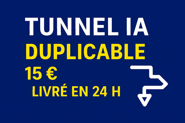 17,61 $US pour un tunnel IA pro, livré en 24h, duplicable sans limite. Vous encaissez plus vite, sans coder, sans galérer. Ce service est pensé pour déclencher vos premières ventes dès aujourd’hui. Commandez maintenant et activez votre machine à cash sans friction.