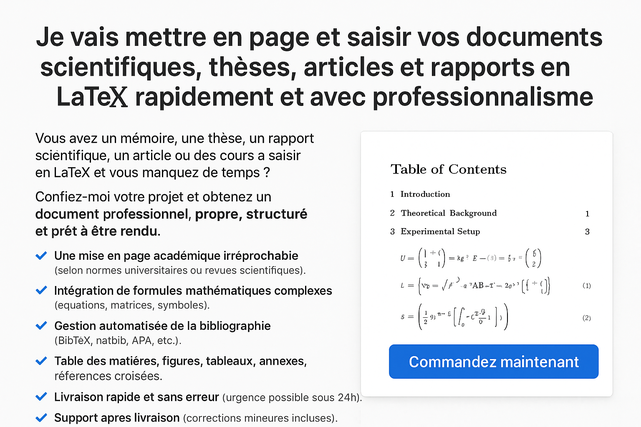 Avec ce service, vous obtiendrez un document LaTeX propre, structuré et prêt à l’usage, vous permettant de vous concentrer sur l’essentiel : votre contenu et vos recherches. Commandez dès maintenant et profitez d’une solution simple, efficace et professionnelle pour tous vos besoins en LaTeX.
