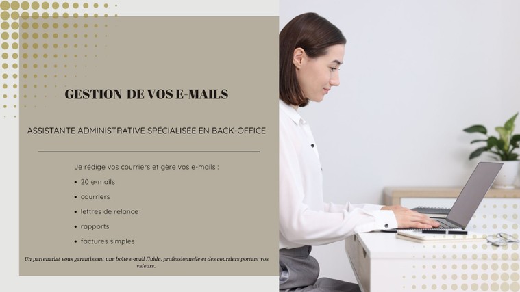 Libérez-vous du quotidien pour conquérir vos objectifs ! 🌟 *Fatigué(e) des tâches administratives qui freinent votre croissance ? Je suis votre alliée pour les tâches administratives: gestion d'emails, factures simples, rédaction de courriers. *Je suis efficace, discrète et ultra-disponible, je transforme le chaos en sérénité pour booster votre productivité! Ma valeur ajoutée ? Voilà ce que vous gagnez en travaillant avec moi : Autonomie de vos actions, Une boîte de réception dégagée, propre et fluide. Pas de spams ou autres e-mails indésirables. Une vision sur l'avancée de mon travail grâce au tableau de suivi partagé. Livraison sous 3 jours. Vos documents sont professionnels, rendus dans le temps imparti. Un travail général de qualité, professionnel, une communication fluide. *Prêt(e) à gagner du temps précieux ? Contactez-moi dès maintenant. Votre succès commence ici 😆!