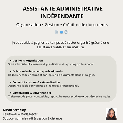 Je suis assistante indépendante, spécialisée en gestion, organisation et support administratif à distance. J’accompagne les entrepreneurs, dirigeants et freelances qui souhaitent déléguer leurs tâches quotidiennes pour se concentrer sur le développement de leur activité.