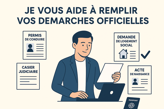 Je vous accompagne dans toutes vos demandes officielles : logement social, DCEM, duplicata de permis de conduire, acte de naissance, acte de mariage, casier judiciaire, et bien plus encore.