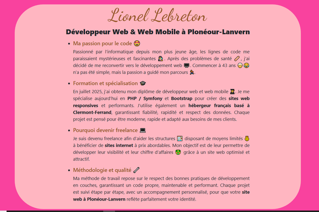Création de sites web sur mesure😃 Aujourd'hui, je me spécialise en PHP/Symfony et Bootstrap pour créer des sites web responsives et performants, adaptés aux besoins spécifiques de mes clients. Pourquoi travailler avec moi ? Expertise technique : Maîtrise de PHP/Symfony, Bootstrap, HTML5, CSS3, JavaScript, MySQL. Approche personnalisée : Chaque projet est unique et bénéficie d'une attention particulière. Accompagnement complet : Du cahier des charges à la mise en ligne, en passant par le design et le développement. Sites responsives : Optimisation pour une expérience utilisateur optimale sur tous les supports (ordinateur, tablette, smartphone). Mes services Je propose des services sur mesure pour : Création de sites vitrines : Présentez votre activité de manière professionnelle et moderne. Développement d'applications web : Solutions personnalisées pour répondre à des besoins spécifiques. Refonte de sites existants : Modernisez votre présence en ligne avec des technologies actuelles.