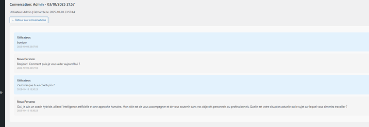 Consultez les historiques des utilisateurs, filtrez par date, exportez les discussions, et gérez les paramètres du chatbot directement depuis votre interface d’administration.