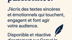 Je crée des contenus textuels émotionnels et authentiques, adaptés à vos besoins.