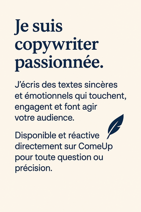 ✍️ Je suis copywriter passionnée. J’écris des textes sincères et émotionnels qui touchent, engagent et font agir votre audience. Disponible et réactive directement sur ComeUp pour toute question ou précision.