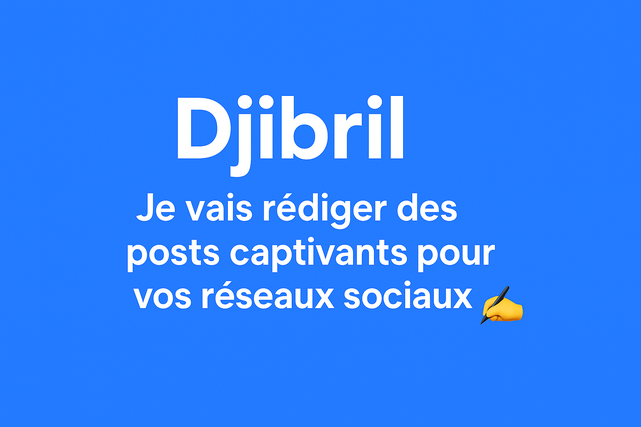 Salut 👋 moi c’est Djibril, un jeune passionné de communication et de création de contenu. 💡 J’aide les particuliers, les marques et les entreprises à rédiger des posts attractifs pour leurs réseaux sociaux (Facebook, Instagram, TikTok, LinkedIn, etc.). Mon objectif ? Transformer tes idées en contenus clairs, impactants et modernes qui attirent l’attention et font réagir ton audience. 🔥 Ce que je t’apporte : • Des textes originaux et percutants • Un ton adapté à ton public • Des publications prêtes à poster • Une approche jeune, créative et dans l’air du temps 🚀 Ensemble, faisons briller ton image sur les réseaux !