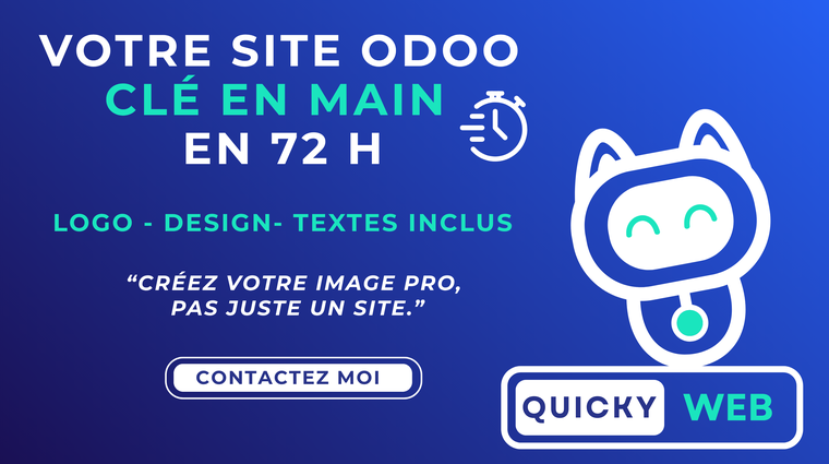 🚀 Quicky Web – Votre site Odoo clé en main livré en 72 h Je crée des sites professionnels modernes, performants et prêts à vendre. Logo, design, textes : tout est inclus, tout est prêt. 🎨 Mon approche : rapidité, clarté, efficacité. Vous remplissez un court formulaire, et je m’occupe de tout. En 72 h, votre entreprise a une image professionnelle complète et un site opérationnel, sans stress ni perte de temps. 💡 Pourquoi Odoo ? Parce que c’est la solution tout-en-un qui relie votre site à votre gestion (CRM, ventes, devis, facturation). Votre site n’est plus une vitrine : c’est un outil de croissance. 📍 Basé en France, j’accompagne freelances, artisans, coachs et PME vers une présence web rapide, propre et efficace.