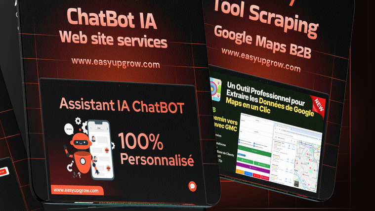 Nos Services La meilleure solution pour votre business 🎨 Identité Visuelle & Branding Nous créons une identité visuelle stratégique et professionnelle (logo, couleurs, typographie) afin de renforcer votre image de marque et assurer une cohérence visuelle forte sur tous vos supports de communication. 👉 Voir le service complet 🌍 Génération de Trafic Ciblé (Visiteurs Réels) Nous générons du trafic web réel, ciblé et qualifié, adapté à votre niche et à vos objectifs commerciaux, afin d’augmenter la visibilité, l’engagement et les conversions. 👉 Voir le service complet 📈 Data & Extraction de Leads (Google Maps) Nous proposons des solutions avancées pour extraire des leads professionnels 100 % qualifiés depuis Google Maps, idéales pour la prospection B2B locale et internationale. 👉 Extension Leads Scraper 👉 Voir le service complet ⚙️ Automatisation & Prospection Marketing Nous mettons en place des outils puissants pour automatiser votre prospection et vos campagnes marketing, réduire le travail manuel et améliorer vos performances commerciales. 👉 Voir le service complet 💻 Développement Web – Sites sur mesure Nous concevons des sites web modernes, rapides et entièrement personnalisés, pensés pour offrir une excellente expérience utilisateur et maximiser la conversion. 👉 Site web sur mesure HTML5 / CSS3 / JS 👉 Site e-commerce connecté à WhatsApp Business 🤖 ChatBot IA Personnalisé – 24/7 Nous concevons des chatbots IA intelligents et personnalisés, capables de répondre automatiquement aux visiteurs, qualifier les leads et améliorer l’expérience client 24h/24 et 7j/7. 👉 Voir le service complet ✉️ Email Marketing Automatisé Nous mettons en place des solutions d’email marketing automatisées pour prospecter, convertir et fidéliser vos clients, tout en augmentant vos taux d’ouverture et de conversion. 👉 Voir le service complet 📲 WhatsApp Marketing Automatisé Nous déployons des programmes d’automatisation WhatsApp pour vos campagnes marketing, permettant l’envoi ciblé et personnalisé de messages à fort taux d’engagement. 👉 Voir le service complet 🎥 YouTube – Création & Optimisation de Chaîne Nous créons et optimisons entièrement votre chaîne YouTube professionnelle afin d’améliorer votre visibilité, votre crédibilité et votre croissance organique. 👉 Voir le service complet 📱 Réseaux Sociaux – Contenu & Optimisation Nous concevons des contenus modernes, créatifs et optimisés pour renforcer votre présence sur les réseaux sociaux et engager efficacement votre audience. 👉 Posts réseaux sociaux – Design & contenu 👉 Optimisation page LinkedIn professionnelle 👉 Optimisation compte Instagram professionnel