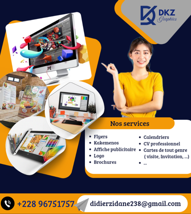 Laissez moi donner vie à tous ce que vous faites parmes création : Création de logo, affiches, flyers, cartes de visite, bannières à partir de 30.000 francs CFA. Alors en cas de besoin d'un Graphic Designer n'hésitez surtout pas à me contacter.