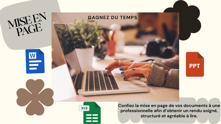 Je prends en charge la mise en forme et/ou mise en page complète de vos :rapports, e-books, CV, support de courts, présentation, design, et plus encore. L'objectif est de transformer vos contenus bruts en documents clairs, élégants et agréables à lire.