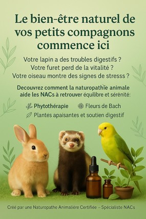 Bonjour ! Je suis **Jennifer**, **Naturopathe Animalier Certifiée (ASA ACACED)**. Je suis spécialisée dans l'accompagnement holistique des **NACs** (Lapins, Rongeurs, Oiseaux, Furets) et des **Équidés** (Chevaux, Poneys, Ânes).